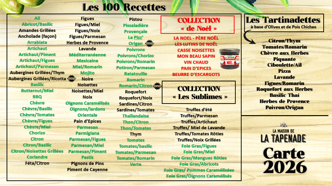 Nous vous proposons GRATUITEMENT la conception et la réalisation de vos TAPENADES sur Mesure ! Nous conçevons la (les) recettes de A à Z !
